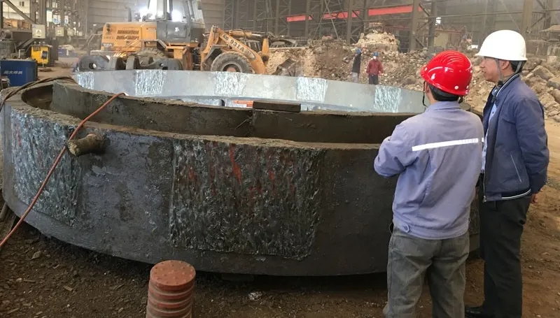 The process of casting a rotary kiln tyre blank first involves the preparation of a precise mold, usually using the sand casting method. Next, alloy materials suitable for high temperature and heavy load conditions are selected for smelting to ensure that the chemical composition meets the standards. The molten metal is then injected into the mold, and the pouring speed and temperature are controlled to ensure quality. After the casting is cooled and solidified in the mold, the mold is removed and the surface sandy residue is cleaned. Finally, a preliminary inspection of the blank is carried out to check the dimensional accuracy, surface quality and internal defects to ensure that it meets the design and use requirements.