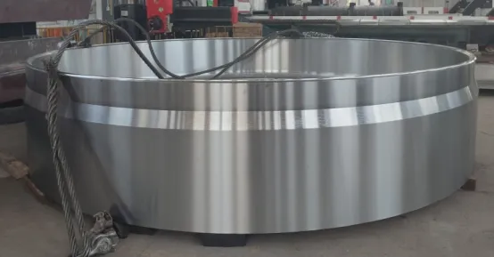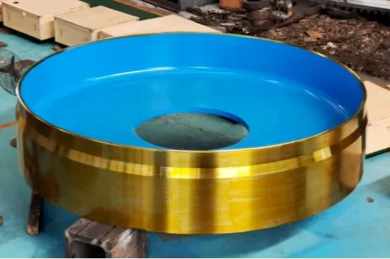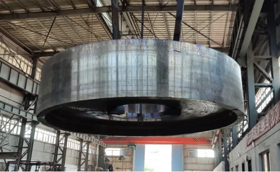 The outer ring is forged 42CrMo alloy steel, the web part is Q235, and the web thickness is 90mm. It needs to open a U-shaped groove for double-sided welding. The welding area is relatively long, with a diameter of 4.5 meters and a circumference of more than 14 meters. In order to reduce welding stress and deformation, staggered intermittent welding is required. At the same time, the entire workpiece must be heated to 200℃ before welding. The welders need to wear heat-insulating clothing. Due to the large amount of welding, when the welding is stopped in the middle, the entire workpiece needs to be placed in a heating furnace for insulation until the welding is completed. The entire workpiece is annealed and then UT flaw detection is performed on all welding positions.